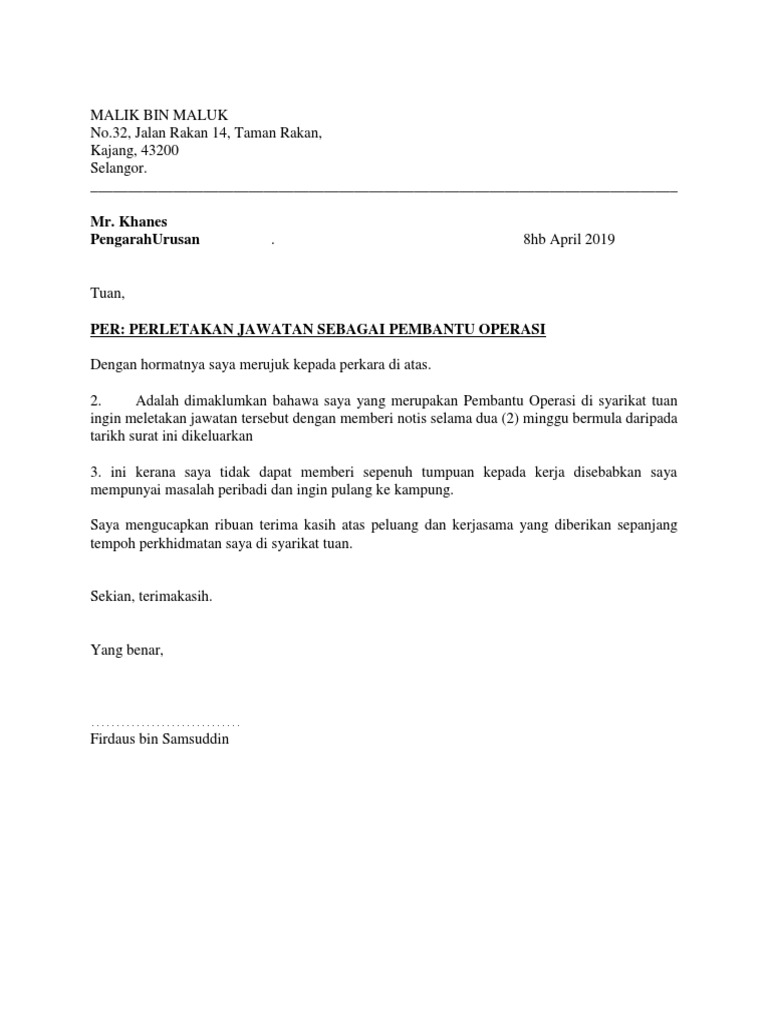 Seminggu Operator Kilang Seminggu Contoh Surat Berhenti Kerja